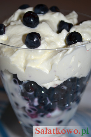 | Wykonanie: | Opłukane i osuszone jagody wsypać do pucharków lub wysokich szklanek. Zalać jogurtem. Śmietankę kremówkę ubić, pod koniec ubijania dodać cukier puder i jeszcze przez chwilę ubijać. Śmietanę przełożyć do szprycy i udekorować pucharki. Na wierzch ułożyć jagody. Deser podawać po lekkim schłodzeniu, najlepiej w dniu przygotowania. |