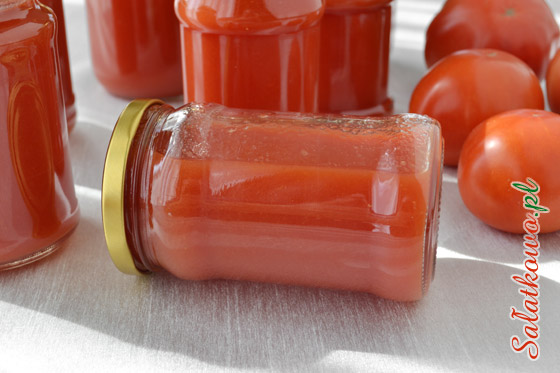 Pomidory umyć, przelać wrzątkiem i obrać ze skórki, pokroić na ćwiartki, usunąć gniazda nasienne. Włożyć do szerokiego, dużego garnka, przykryć pokrywką i gotować przez 15 - 20 minut na większym ogniu, w międzyczasie kilka razy przemieszać. Rozgotowane pomidory przetrzeć przez sito do drugiego garnka i ponownie zagotować. Dodać sól i cukier (jeśli dodajemy). Gotować przez 20 - 30 minut na większym ogniu bez pokrywki, aby odparować nadmiar soku, aby przecier powstał bardziej gęsty. Gorący przecier przelać do słoików i zakręcić. Pasteryzować: słoiki zawinąć w papier, aby nie uderzały o siebie podczas gotowania, wstawić do dużego garnka wyłożonego bawełnianą ściereczką. Wlać gorącą wodę do 2/3 wysokości słoików (jeśli słoiki są gorące, to i woda do gotowania też gorąca, inaczej słoiki mogłyby popękać). Słoiki zagotować i pasteryzować 10 minut od zagotowania wody. Następnie ostrożnie wyjąć i pozostawić do ostygnięcia. Można wynieść w chłodne miejsce. Propozycja podania: do zupy pomidorowej lub pomidorowych sosów. Smacznego! |