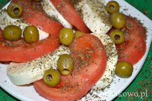 | Składniki: | 40 dag sera mozzarella (2 kulki) 2 pomidory garść zielonych oliwek bez pestek świeżo zmielony pieprz oliwa z oliwek bazylia do dekoracji (może być suszona) |